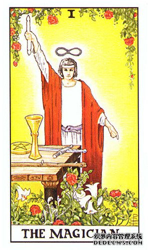 物語一:牌的桌面擺了宇宙四要素:生命樹(火)、劍(風)、五芒星(土)、圣杯(水)。魔術師頭頂上有個無限大的符號,腰帶為一條頭尾相接的蛇,是精神永恒的象征。魔術師右手拿著權杖指向天空,左手指著地面,代表權利的交流和精神的贈與。魔術師腳底下為玫瑰和百合,表示人類的動機,反映神的意志,指揮天地。玫瑰代表生,百合代表死亡。魔術師暗示你具備條件開展計劃。